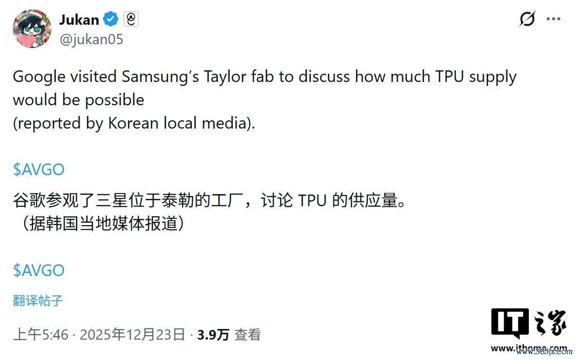 IT之家 12 月 25 日音尘,音尘源 @jukan05 于 12 月 23 日在 X 平台发布推文,爆料称谷歌高管近期造访了三星位于好意思国得克萨斯州泰勒市的半导体工场,两边就外包分娩 TPU 事宜伸开了谈判。